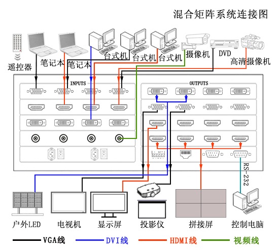 混合矩阵:多类型接口多路输入,多类型接口多路输出,具体的说:输入和输出可以包含DVI、HDMI、SDI、VGA、RGB、AV等接口。混合矩阵是插卡式的,每块板卡一般有4个完全相同的接口,输入和输出都是如此,混合矩阵是输入板卡、输出板卡、机箱这三个部分组成。